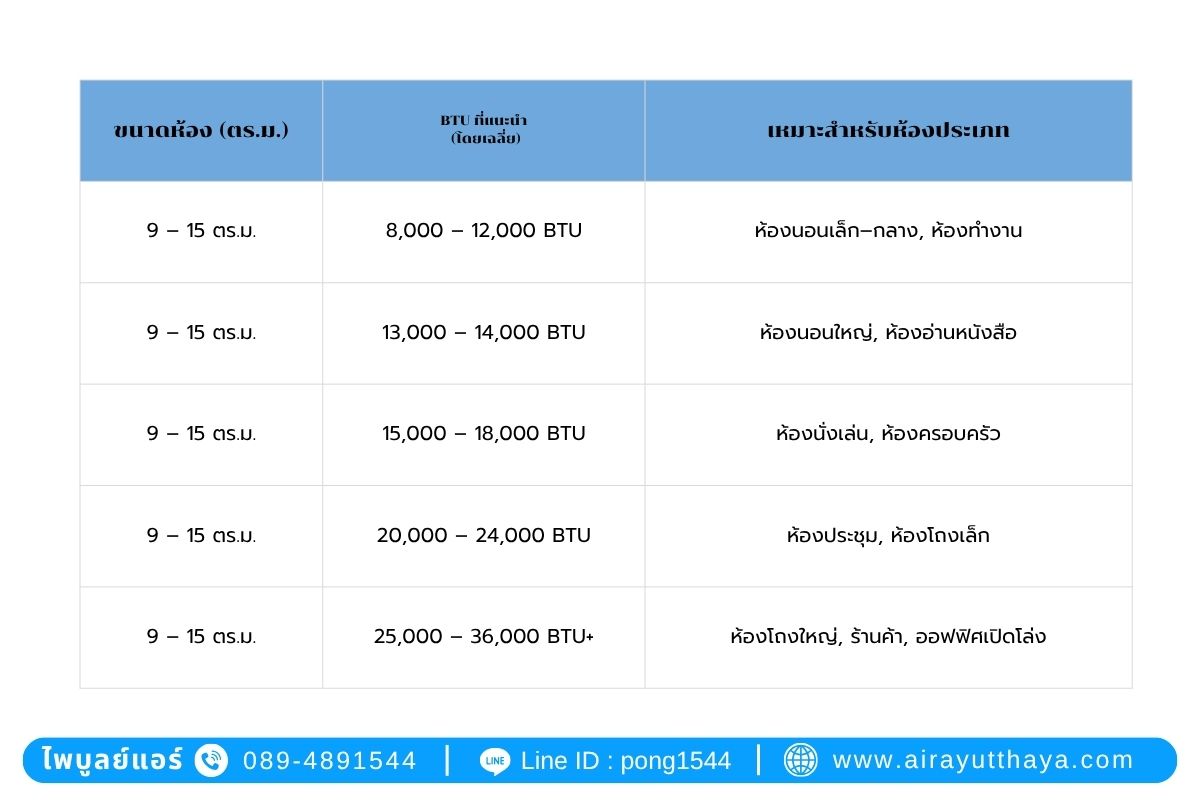 ตารางแนะนำขนาด BTU กับขนาดห้อง
